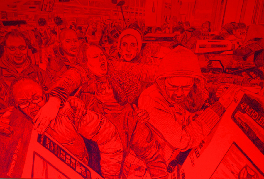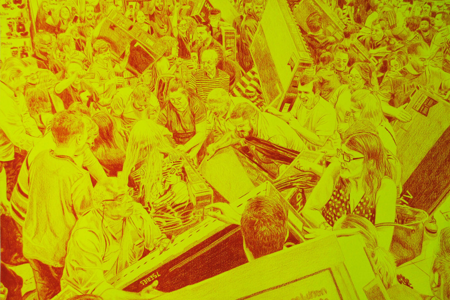 Black Friday II, 2019. Colored pencil on fluorescent paper, 30 x 42 cm.