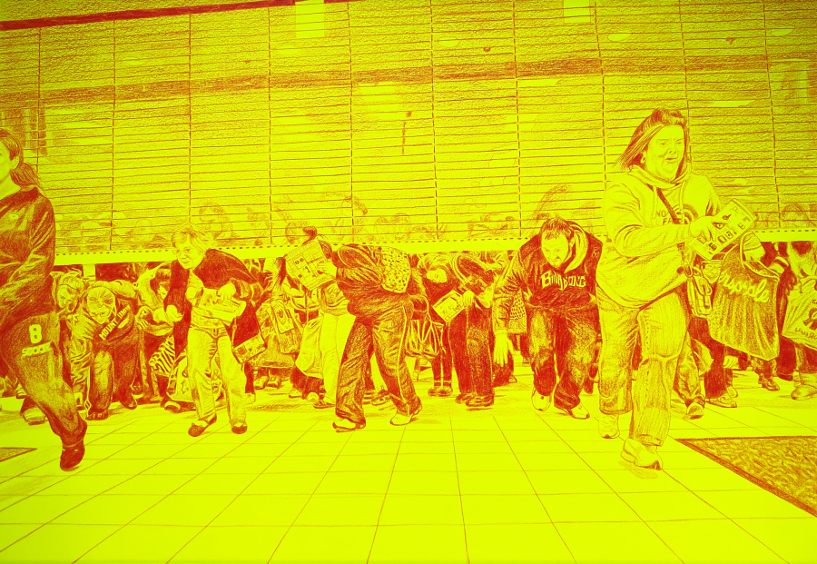 Black Friday I, 2019. Colored pencil on fluorescent paper, 20 x 30 cm.