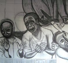Darfurnica is really starting to come together now. It feels a bit surreal that this gigantic painting which started out as a dream is now actually here in front of me and almost finished. I am very excited about putting my exhibition together in Copenhagen and can't wait to open the show. Most of the people I know had never heard some of the stories I have painted in Darfurnica. For example, the fact that Sudan's president Omar al-Bashir had his people paint bombers white and stencil them with the UN logo before bombing villages in Darfur – leaving the people there thinking that help was coming only to realize the opposite. The cruelty in the actions of the government in Sudan is something that shouldn't be left unspoken.