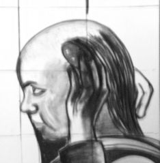 Today I started working on a sketch of Sudan's President, Omar Hassan al-Bashir. Yesterday it was four months ago that the International Criminal Court issued his arrest warrant. He was charged with war crimes and crimes against humanity in Darfur. President Omar al-Bashir's government responded by expelling 13 humanitarian groups from Darfur and seizing their assets, threatening lifesaving operations, a U.N. spokeswoman said. The Huffington Post reported that “In the Sudanese capital of Khartoum, the government denounced the warrant as part of a Western conspiracy aimed at destabilizing the vast oil-rich nation south of Egypt. "There will be no recognition of or dealing with the white man's court, which has no mandate in Sudan or against any of its people," the Information Ministry said. Al-Bashir, who denies the accusations, drove through the capital after the warrant was announced, waving at crowds. So far, al-Bashir has shown no remorse what so ever about the situation in Darfur and continues his horrifying atrocities. In Darfurnica I will portray him painting bombers to disguise them as UN planes. In April 2007 The Times published an article based on a report from the United Nations. “The report’s most astonishing revelation was the use by the Sudanese armed forces of white-painted military aircraft in Darfur. On March 7 (2007) a photograph was taken of an Antonov AN26 aircraft on the military apron of al-Fasher airport, the Darfuri regional capital. Guarded by soldiers and with bombs piled alongside, the plane was painted white and had the initials “UN” stenciled on its upper left wing. Another Sudanese military aircraft was disguised in the same manner. The report said that white Antonovs were used to bombard Darfur villages on at least three occasions in January 2007. A similar ploy was employed to conceal the identity of three Mi171 military helicopters which were painted white. The report said that from a distance the aircraft could be mistaken for similar helicopters operated by the UN and peacekeepers.” Imagine the Darfuris seeing the planes coming, thinking it is the United Nations, only to realize that it is bombers... It is psychotic how creative human beings can be when it comes to killing each other.