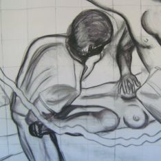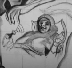 Today I finished working on the rape scene in Darfurnica. Rape has been used as a cruel weapon throughout the atrocities and numerous women and girls as young as four(!) face rape on a daily basis in Darfur. Usually it is not even the act by a single man, but gang rapes. Besides the physical and emotional pain after such a horrific experience the women also risk facing social problems within their families and communities as they are considered “unclean”.