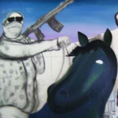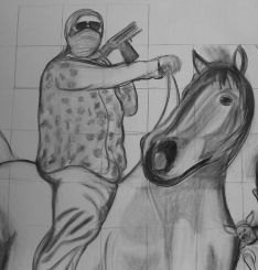 Today I added a Janjaweed to my painting. The word means "a man with a gun on a horse". I always found the horse in Guernica very powerful and when I first started thinking about a possible Darfurnica, it felt obvious to portray the government-backed militiamen as one of the center pieces in the work. Since the crisis in Darfur started in 2003, the Janjaweed militiamen has killed numerous African people, forced them out of their villages and raped the women. They have been accused of some of the worst human rights violations. In 2008, Sudan's president Omar Hassan al-Bashir promoted Musa Hilal, a suspected leader of the Janjaweed, to a senior adviser post in the government. Many human rights groups protested, but President Al Bashir was quoted as saying, "Musa Hilal contributed greatly to stability and security in the region". There are many reports from international aid workers maintaining that Janjaweed raids are backed up with bombardments by the Sudanese air force and that Janjaweed militiamen wear combat outfits similar to those of the regular army. According to Sudan researcher Alex de Waal, an official statement from Sheikh Musa Hilal's headquarters in 2004 demanded the militias to "change the demography of Darfur and empty it of African tribes". So when people still argue that the situation in Darfur isn't genocide but civil war, I feel like asking them: How fair is a war where one side is provided with guns and helicopters by the government, and the other side has sticks to defend themselves with and nowhere to hide? I read an interview with a refugee from Darfur who lost his 4-year old daughter when his village was attacked by the Janjaweed. She was killed in front of him by one of the militias who stabbed her with his machete and then paraded around the village on his horse, with the little girl still hanging on top of the machete. The father explained how this exact image of his daughter was all he had in his head. Since I read about it, the image has also stayed in my head.